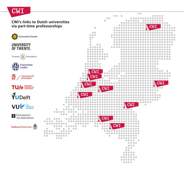 Daarnaast stromen CWI-onderzoekers geregeld door naar een universiteit. Sinds de oprichting van het CWI in 1946 zijn ruim 230 CWI-onderzoekers voltijdhoogleraar geworden aan dertien universiteiten (of in het buitenland): TU Delft, TU Eindhoven, Universiteit Twente, Universiteit van Amsterdam, Vrije Universiteit, Universiteit Leiden, Universiteit Utrecht, Erasmus Universiteit Rotterdam, Rijksuniversiteit Groningen, Radboud Universiteit, Maastricht University, Wageningen University & Research, Tilburg University.